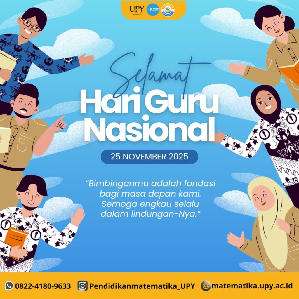 Keluarga besar Program Studi Pendidikan Matematika, Fakultas Keguruan dan Ilmu Pendidikan, Universitas PGRI Yogyakarta, mengucapkan Selamat Hari Guru Nasional 2025 kepada seluruh pendidik di Indonesia yang telah mendedikasikan diri dengan penuh keikhlasan dan cinta terhadap dunia pendidikan.